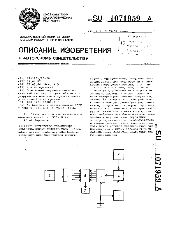 Устройство управления к ультразвуковому дефектоскопу / Чегоринский В. А.; заявитель: Всесоюзный научно-исследовательский институт по разработке неразрушающих методов и средств контроля качества материалов // Описания изобретений (ретрофонд) / Комитет по патентам и товарным знакам России. – М. — (Патенты России)., 2003. – 1984, № 1. — Загл. с титул. экрана. — Систем. требования: Acrobat Reader. — Режим доступа: ftp://smolensklib.ru/bd/patent_ru/pt1071959.pdf. — <URL:ftp://smolensklib.ru/bd/patent_ru/pt1071959.pdf>.