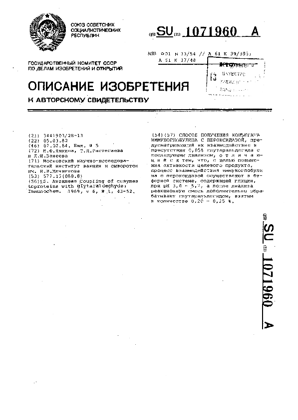 Способ получения конъюгата иммуноглобулина с пероксидазой / Янкина Н. Ф., Растегаева Т. Д., Ванеева Л. И.; заявитель: Московский научно-исследовательский институт вакцин и сывороток им. И. И. Мечникова // Описания изобретений (ретрофонд) / Комитет по патентам и товарным знакам России. – М. — (Патенты России)., 2003. – 1984, № 1. — Загл. с титул. экрана. — Систем. требования: Acrobat Reader. — Режим доступа: ftp://smolensklib.ru/bd/patent_ru/pt1071960.pdf. — <URL:ftp://smolensklib.ru/bd/patent_ru/pt1071960.pdf>.