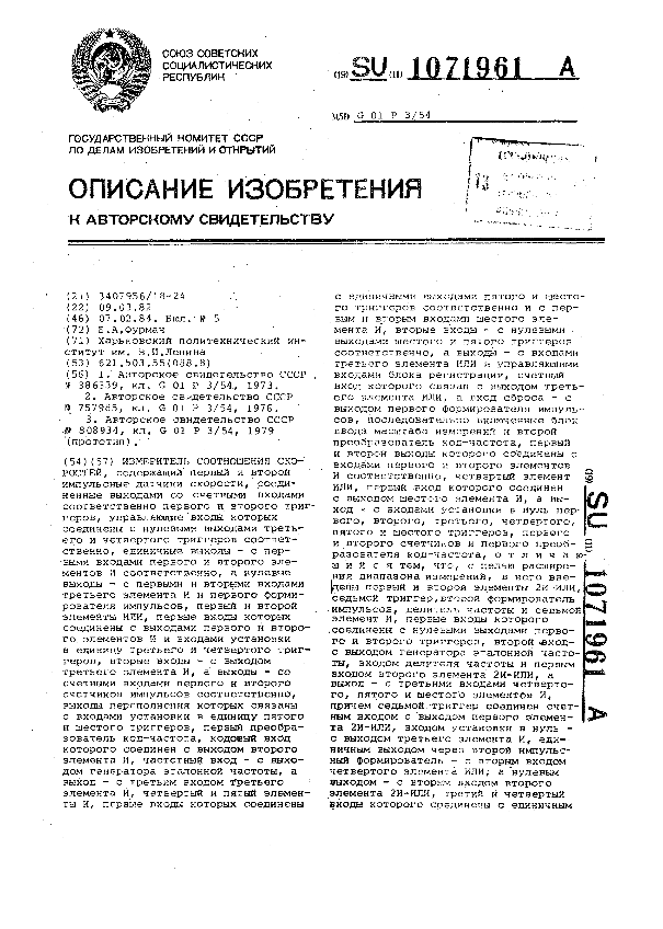 Измеритель соотношения скоростей / Фурман Б. А.; заявитель: Харьковский политехнический, институт им. В. И. Ленина // Описания изобретений (ретрофонд) / Комитет по патентам и товарным знакам России. – М. — (Патенты России)., 2003. – 1984, № 1. — Загл. с титул. экрана. — Систем. требования: Acrobat Reader. — Режим доступа: ftp://smolensklib.ru/bd/patent_ru/pt1071961.pdf. — <URL:ftp://smolensklib.ru/bd/patent_ru/pt1071961.pdf>.