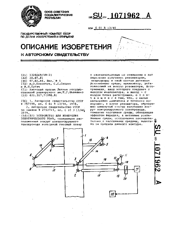 Устройство для измерения электрического тока / Никончук М. О., Скорик С. С., Пугач И. П.; заявитель: Харьковский политехнический институт им. В. И. Ленина // Описания изобретений (ретрофонд) / Комитет по патентам и товарным знакам России. – М. — (Патенты России)., 2003. – 1984, № 1. — Загл. с титул. экрана. — Систем. требования: Acrobat Reader. — Режим доступа: ftp://smolensklib.ru/bd/patent_ru/pt1071962.pdf. — <URL:ftp://smolensklib.ru/bd/patent_ru/pt1071962.pdf>.