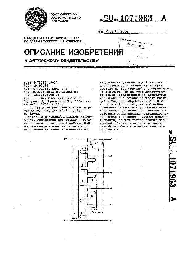 Индуктивный делитель напряжения / Векслер М. С., Кофман М. И. // Описания изобретений (ретрофонд) / Комитет по патентам и товарным знакам России. – М. — (Патенты России)., 2003. – 1984, № 1. — Загл. с титул. экрана. — Систем. требования: Acrobat Reader. — Режим доступа: ftp://smolensklib.ru/bd/patent_ru/pt1071963.pdf. — <URL:ftp://smolensklib.ru/bd/patent_ru/pt1071963.pdf>.