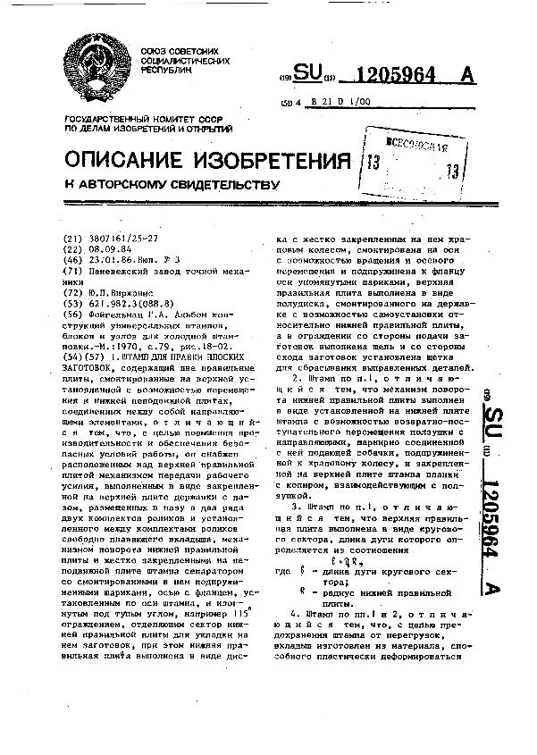 Штамп для правки плоских заготовок / Виржонис Ю. П.; заявитель: Паневежский завод точной механик // Описания изобретений (ретрофонд) / Комитет по патентам и товарным знакам России. – М., 2003. – 1986, № 1. — (Патенты России). — Загл. с титул. экрана. — Поисковая система: ИПС MIMOSA GTI. — Систем. требования: Acrobat Reader. — Режим доступа: ftp://smolensklib.ru/bd/patent_ru/pt1205964.pdf. — <URL:ftp://smolensklib.ru/bd/patent_ru/pt1205964.pdf>.