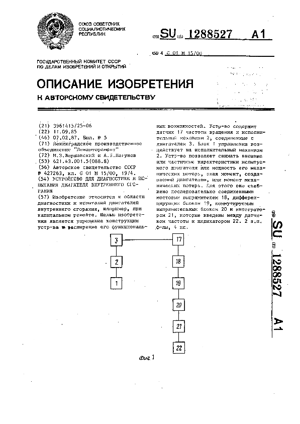Устройство для диагностики и испытания двигателя внутреннего сгорания / Варшавский М. З., Лагунов А. Б.; заявитель: Ленинградское производственное объединение "Ленавторемонт" // Описания изобретений (ретрофонд) / Комитет по патентам и товарным знакам России. – М., 2003. – 1987, № 1. — (Патенты России). — Загл. с титул. экрана. — Поисковая система: MIMOSA GTI. — Систем. требования: Acrobat Reader. — Режим доступа: ftp://smolensklib.ru/bd/patent_ru/pt1288527.pdf. — <URL:ftp://smolensklib.ru/bd/patent_ru/pt1288527.pdf>.