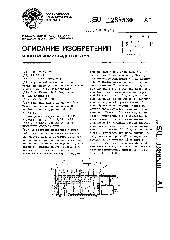 Установка для определения механического состава почв / Гахов В. Ф., Карталова В. З., Плеханова Л. И.; заявитель: Украинский научно-исследовательский институт почвоведения и агрохимии им. А. Н. Соколовского // Описания изобретений (ретрофонд) / Комитет по патентам и товарным знакам России. – М., 2003. – 1987, № 1. — (Патенты России). — Загл. с титул. экрана. — Поисковая система: MIMOSA GTI. — Систем. требования: Acrobat Reader. — Режим доступа: ftp://smolensklib.ru/bd/patent_ru/pt1288530.pdf. — <URL:ftp://smolensklib.ru/bd/patent_ru/pt1288530.pdf>.