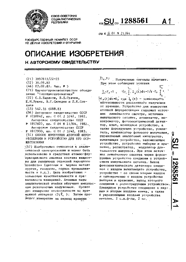 Способ измерения атомной флуоресценции и устройство для его осуществления / Баранов С. В., Грачев Б. Д., Букин Е. М. [и др.]; заявитель: Научно-производственное объединение "Союзцветавтоматика" // Описания изобретений (ретрофонд) / Комитет по патентам и товарным знакам России. – М., 2003. – 1987, № 1. — (Патенты России). — Загл. с титул. экрана. — Поисковая система: MIMOSA GTI. — Систем. требования: Acrobat Reader. — Режим доступа: ftp://smolensklib.ru/bd/patent_ru/pt1288561.pdf. — <URL:ftp://smolensklib.ru/bd/patent_ru/pt1288561.pdf>.