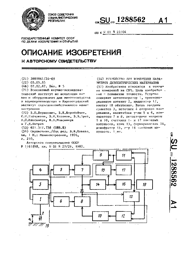 Устройство для измерения параметров диэлектрических материалов / Борисевич В. Ю., Воробейчик В. Я., Гайдукова С. Н. [и др.]; заявитель: Всесоюзный научно-исследовательский институт по испытанию машин и оборудования для животноводства и кормопроизводства, Кировоградский институт сельскохозяйственного машиностроения // Описания изобретений (ретрофонд) / Комитет по патентам и товарным знакам России. – М., 2003. – 1987, № 1. — (Патенты России). — Загл. с титул. экрана. — Поисковая система: MIMOSA GTI. — Систем. требования: Acrobat Reader. — Режим доступа: ftp://smolensklib.ru/bd/patent_ru/pt1288562.pdf. — <URL:ftp://smolensklib.ru/bd/patent_ru/pt1288562.pdf>.