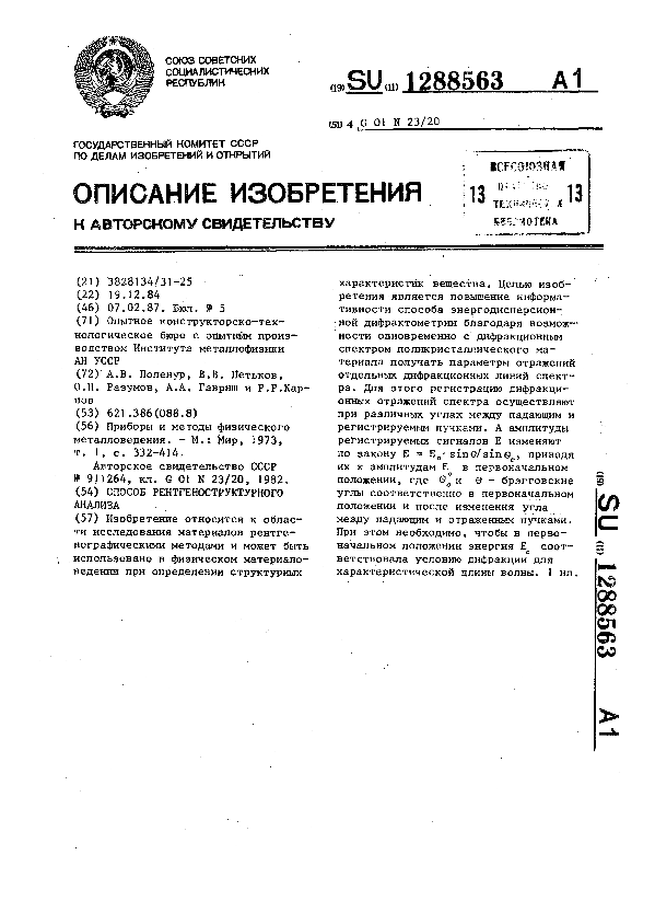 Способ рентгеноструктурного анализа / Поленур А. В., Петьков В. В., Разумов О. Н. [и др.]; заявитель: Опытное конструкторско-технологическое бюро с опытным производством Института металлофизики АН УССР // Описания изобретений (ретрофонд) / Комитет по патентам и товарным знакам России. – М., 2003. – 1987, № 1. — (Патенты России). — Загл. с титул. экрана. — Поисковая система: MIMOSA GTI. — Систем. требования: Acrobat Reader. — Режим доступа: ftp://smolensklib.ru/bd/patent_ru/pt1288563.pdf. — <URL:ftp://smolensklib.ru/bd/patent_ru/pt1288563.pdf>.