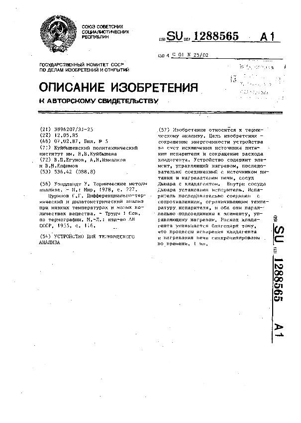 Устройство для термического анализа / Егунов В. П., Измалков А. Н., Ялфимов В. Н.; заявитель: Куйбышевский политехнический институт им. В. В. Куйбышева // Описания изобретений (ретрофонд) / Комитет по патентам и товарным знакам России. – М., 2003. – 1987, № 1. — (Патенты России). — Загл. с титул. экрана. — Поисковая система: MIMOSA GTI. — Систем. требования: Acrobat Reader. — Режим доступа: ftp://smolensklib.ru/bd/patent_ru/pt1288565.pdf. — <URL:ftp://smolensklib.ru/bd/patent_ru/pt1288565.pdf>.