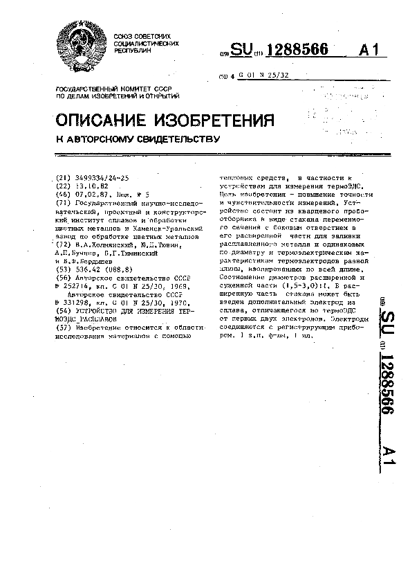Устройство для измерения термоЭДС расплавов / Холмянский В. А., Тювин Ю. Д., Бучнев А. П. [и др.]; заявитель: Государственный научно-исследовательский, проектный и конструкторский институт сплавов и обработки цветных металлов, Каменск-Уральский завод по обработке цветных металлов // Описания изобретений (ретрофонд) / Комитет по патентам и товарным знакам России. – М., 2003. – 1987, № 1. — (Патенты России). — Загл. с титул. экрана. — Поисковая система: MIMOSA GTI. — Систем. требования: Acrobat Reader. — Режим доступа: ftp://smolensklib.ru/bd/patent_ru/pt1288566.pdf. — <URL:ftp://smolensklib.ru/bd/patent_ru/pt1288566.pdf>.
