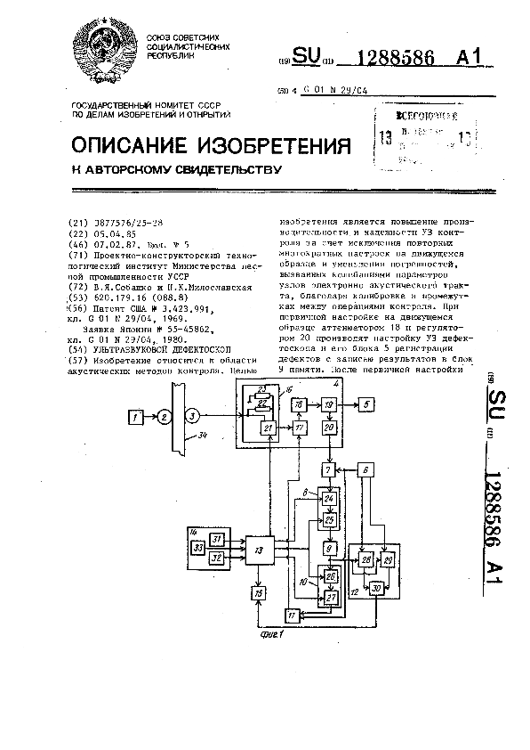 Ультразвуковой дефектоскоп / Собашко В. Я., Милославская Н. К.; заявитель: Проектно-конструкторский технологический институт Министерства лесной промышленности УССР // Описания изобретений (ретрофонд) / Комитет по патентам и товарным знакам России. – М., 2003. – 1987, № 1. — (Патенты России). — Загл. с титул. экрана. — Поисковая система: MIMOSA GTI. — Систем. требования: Acrobat Reader. — Режим доступа: ftp://smolensklib.ru/bd/patent_ru/pt1288586.pdf. — <URL:ftp://smolensklib.ru/bd/patent_ru/pt1288586.pdf>.