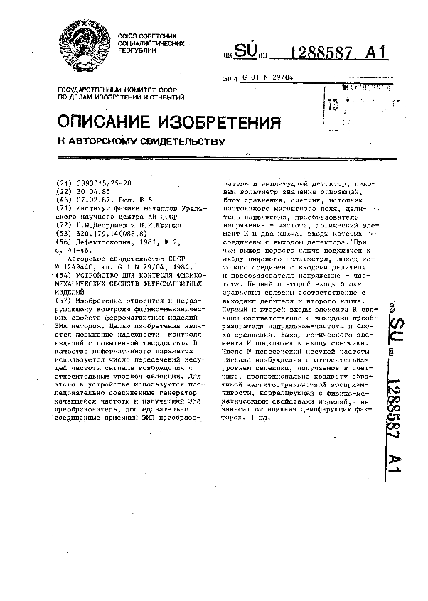 Устройство для контроля физико-механических свойств ферромагнитных изделий / Деордиев Г. И., Шакшин Н. И.; заявитель: Институт физики металлов Уральского научного центра АН СССР // Описания изобретений (ретрофонд) / Комитет по патентам и товарным знакам России. – М., 2003. – 1987, № 1. — (Патенты России). — Загл. с титул. экрана. — Поисковая система: MIMOSA GTI. — Систем. требования: Acrobat Reader. — Режим доступа: ftp://smolensklib.ru/bd/patent_ru/pt1288587.pdf. — <URL:ftp://smolensklib.ru/bd/patent_ru/pt1288587.pdf>.