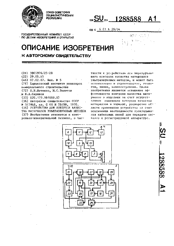 Устройство для контроля качества материалов ультразвуковым методом / Шутенко Л. Н., Золотов М. С., Сериков Я. А.; заявитель: Харьковский институт инженеров коммунального строительства // Описания изобретений (ретрофонд) / Комитет по патентам и товарным знакам России. – М., 2003. – 1987, № 1. — (Патенты России). — Загл. с титул. экрана. — Поисковая система: MIMOSA GTI. — Систем. требования: Acrobat Reader. — Режим доступа: ftp://smolensklib.ru/bd/patent_ru/pt1288588.pdf. — <URL:ftp://smolensklib.ru/bd/patent_ru/pt1288588.pdf>.