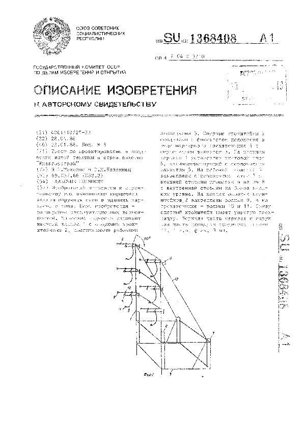 Навесные подмости / Мехелис Н. Э., Коломиец В. М.; заявитель: Трест по проектированию и внедрению новой техники в строительство «Киевгорстрой» // Описания изобретений (ретрофонд) / Комитет по патентам и товарным знакам России. — М., 1994-____. — (Патенты России). – 1988, № 1. — Загл. с титул. экрана. — Поисковая система: ИПС MIMOSA GTI. — Систем. требования: Acrobat Reader. — Режим доступа: ftp://smolensklib.ru/bd/patent_ru/pt1368408.pdf. — <URL:ftp://smolensklib.ru/bd/patent_ru/pt1368408.pdf>.