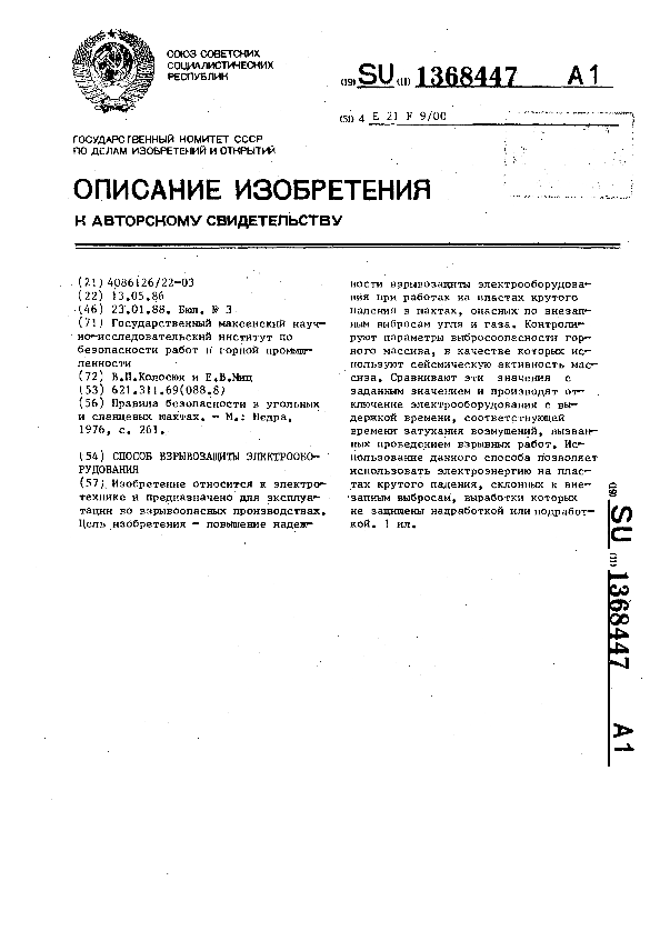 Способ взрывозащиты электрооборудования / Колосюк В. П., Миц Е. В.; заявитель: Государственный макеевский научно-исследовательский институт по безопасности работ в горной промышленности // Описания изобретений (ретрофонд) / Комитет по патентам и товарным знакам России. — М., 1994-____. — (Патенты России). – 1988, № 1. — Загл. с титул. экрана. — Поисковая система: ИПС MIMOSA GTI. — Систем. требования: Acrobat Reader. — Режим доступа: ftp://smolensklib.ru/bd/patent_ru/pt1368447.pdf. — <URL:ftp://smolensklib.ru/bd/patent_ru/pt1368447.pdf>.