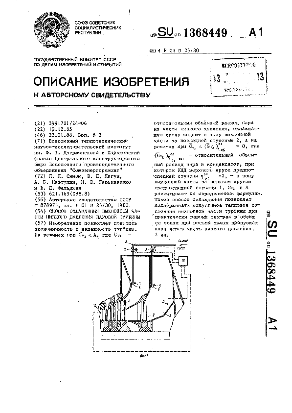 Способ охлаждения выхлопной части низкого давления паровой турбины / Симою Л. Л., Лагун В. П., Нафтулин А. Б. [и др.]; заявитель: Всесоюзный теплотехнический научно-исследовательский институт им. Ф. Э. Дзержинского, Харьковский филиал Центрального конструкторского бюро Всесоюзного производственного объединения "Союзэнергоремонт" // Описания изобретений (ретрофонд) / Комитет по патентам и товарным знакам России. — М., 1994-____. — (Патенты России). – 1988, № 1. — Загл. с титул. экрана. — Поисковая система: ИПС MIMOSA GTI. — Систем. требования: Acrobat Reader. — Режим доступа: ftp://smolensklib.ru/bd/patent_ru/pt1368449.pdf. — <URL:ftp://smolensklib.ru/bd/patent_ru/pt1368449.pdf>.