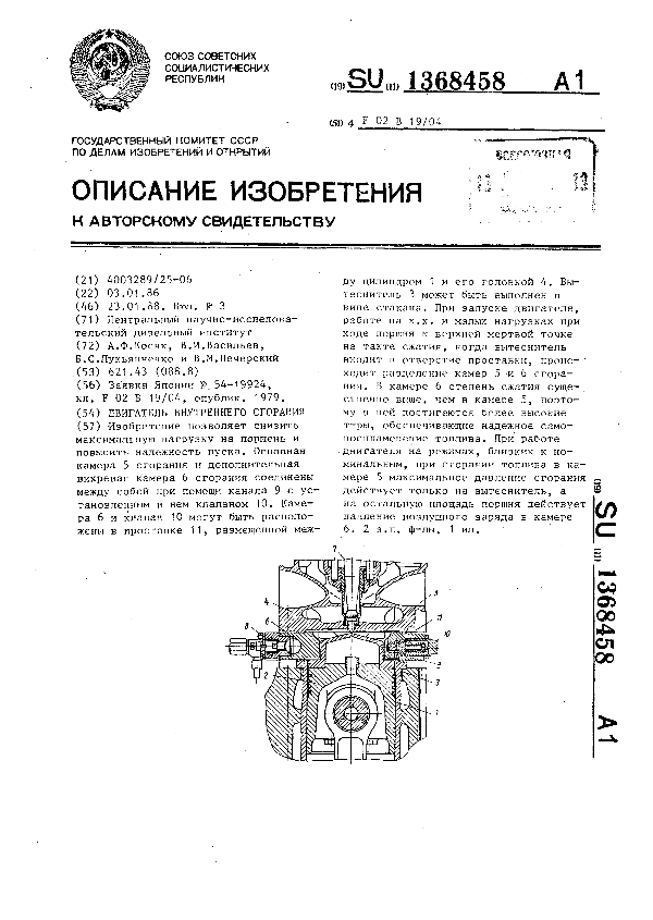 Двигатель внутреннего сгорания / Косяк А. Ф., Васильев В. И., Лукьянченко Б. С., Печерский В. М.; заявитель: Центральный научно-исследовательский дизельный институт // Описания изобретений (ретрофонд) / Комитет по патентам и товарным знакам России. — М., 1994-____. — (Патенты России). – 1988, № 1. — Загл. с титул. экрана. — Поисковая система: ИПС MIMOSA GTI. — Систем. требования: Acrobat Reader. — Режим доступа: ftp://smolensklib.ru/bd/patent_ru/pt1368458.pdf. — <URL:ftp://smolensklib.ru/bd/patent_ru/pt1368458.pdf>.