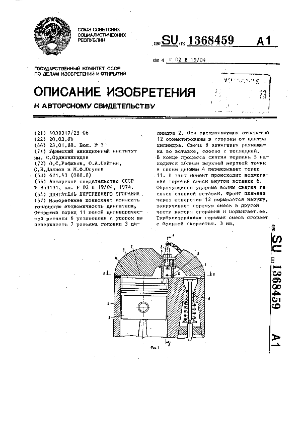 Двигатель внутреннего сгорания / Рафиков О. С., Сайгин О. А., Даянов С. Б., Юсупов М. Ф.; заявитель: Уфимский авиационный институт им. С. Орджоникидзе // Описания изобретений (ретрофонд) / Комитет по патентам и товарным знакам России. — М., 1994-____. — (Патенты России). – 1988, № 1. — Загл. с титул. экрана. — Поисковая система: ИПС MIMOSA GTI. — Систем. требования: Acrobat Reader. — Режим доступа: ftp://smolensklib.ru/bd/patent_ru/pt1368459.pdf. — <URL:ftp://smolensklib.ru/bd/patent_ru/pt1368459.pdf>.