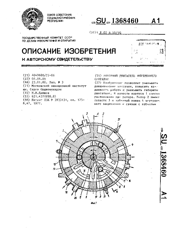 Роторный двигатель внутреннего сгорания / Дайнов М. И.; заявитель: Московский авиационный институт им. Серго Орджоникидзе // Описания изобретений (ретрофонд) / Комитет по патентам и товарным знакам России. — М., 1994-____. — (Патенты России). – 1988, № 1. — Загл. с титул. экрана. — Поисковая система: ИПС MIMOSA GTI. — Систем. требования: Acrobat Reader. — Режим доступа: ftp://smolensklib.ru/bd/patent_ru/pt1368460.pdf. — <URL:ftp://smolensklib.ru/bd/patent_ru/pt1368460.pdf>.