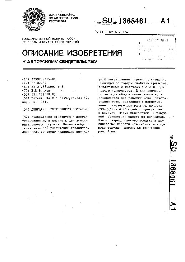 Двигатель внутреннего сгорания / Внуков В. В. // Описания изобретений (ретрофонд) / Комитет по патентам и товарным знакам России. — М., 1994-____. — (Патенты России). – 1988, № 1. — Загл. с титул. экрана. — Поисковая система: ИПС MIMOSA GTI. — Систем. требования: Acrobat Reader. — Режим доступа: ftp://smolensklib.ru/bd/patent_ru/pt1368461.pdf. — <URL:ftp://smolensklib.ru/bd/patent_ru/pt1368461.pdf>.