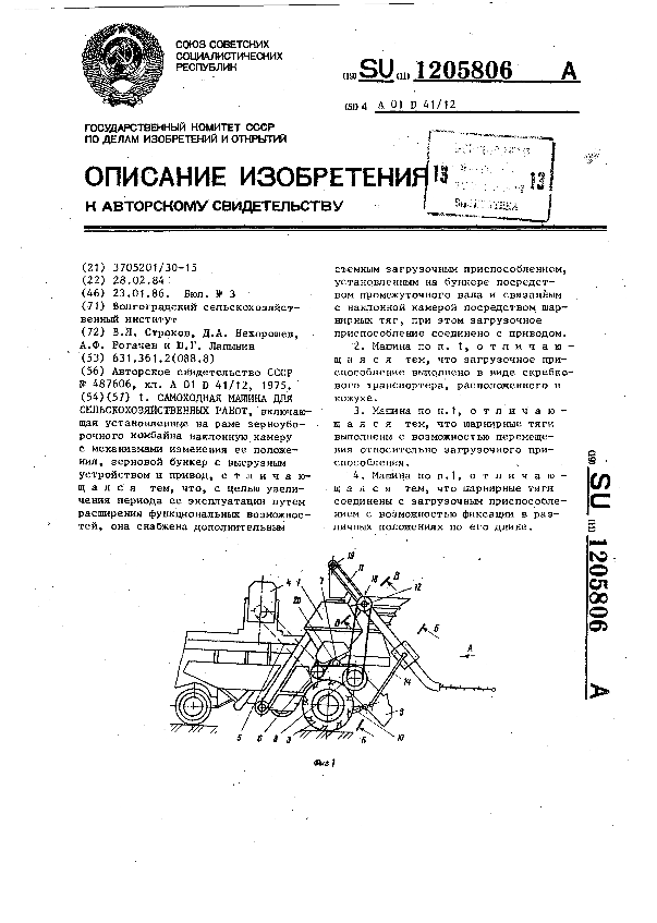 Самоходная машина для сельскохозяйственных работ / Строков В. Л., Нехорошев Д. А., Рогачев А. Ф. [и др.]; заявитель: Волгоградский сельскохозяйственный институт // Описания изобретений (ретрофонд) / Комитет по патентам и товарным знакам России. – М., 2003. – 1986, № 1. — (Патенты России). — Загл. с титул. экрана. — Поисковая система: ИПС MIMOSA GTI. — Систем. требования: Acrobat Reader. — Режим доступа: ftp://smolensklib.ru/bd/patent_ru/pt1205806.pdf. — <URL:ftp://smolensklib.ru/bd/patent_ru/pt1205806.pdf>.