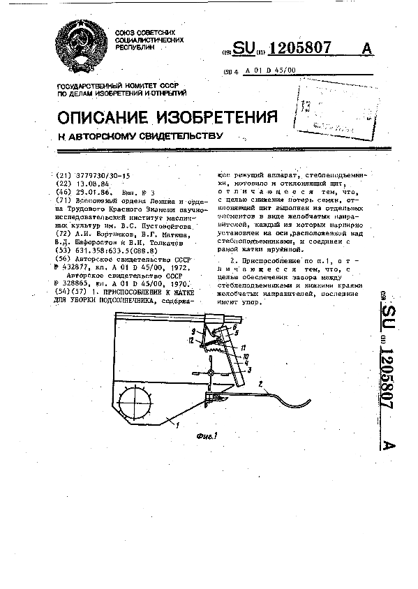 Приспособление к жатке для уборки подсолнечника / Бортников А. И., Матюша В. Г., Шафоростов В. Д. [и др.]; заявитель: Всесоюзный ордена Ленина и ордена Трудового Красного Знамени научно-исследовательский институт масличных культур им. В. С. Пустовойтова. // Описания изобретений (ретрофонд) / Комитет по патентам и товарным знакам России. – М., 2003. – 1986, № 1. — (Патенты России). — Загл. с титул. экрана. — Поисковая система: ИПС MIMOSA GTI. — Систем. требования: Acrobat Reader. — Режим доступа: ftp://smolensklib.ru/bd/patent_ru/pt1205807.pdf. — <URL:ftp://smolensklib.ru/bd/patent_ru/pt1205807.pdf>.