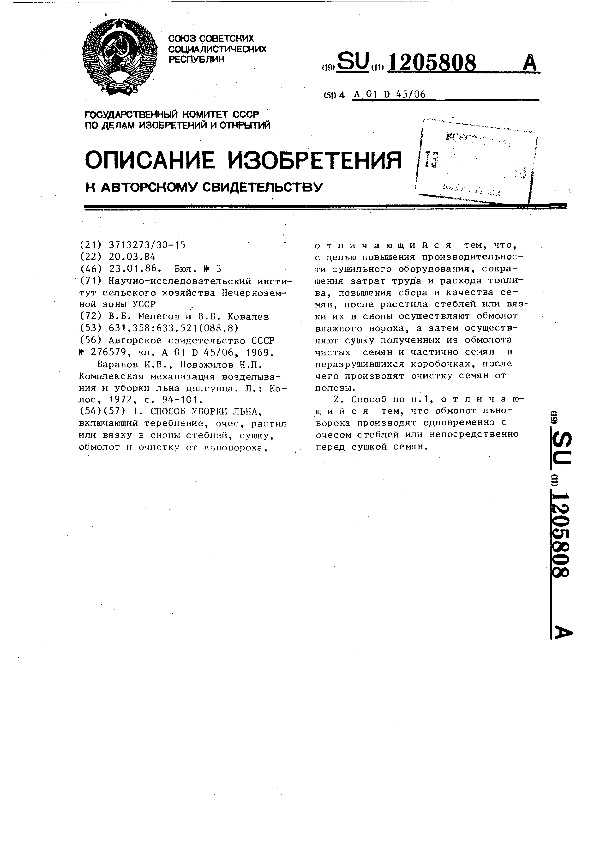 Способ уборки льна / Мелегов В. Б., Ковалев В. Б.; заявитель: Научно-исследовательский институт сельского хозяйства Нечерноземной зоны УССР // Описания изобретений (ретрофонд) / Комитет по патентам и товарным знакам России. – М., 2003. – 1986, № 1. — (Патенты России). — Загл. с титул. экрана. — Поисковая система: ИПС MIMOSA GTI. — Систем. требования: Acrobat Reader. — Режим доступа: ftp://smolensklib.ru/bd/patent_ru/pt1205808.pdf. — <URL:ftp://smolensklib.ru/bd/patent_ru/pt1205808.pdf>.