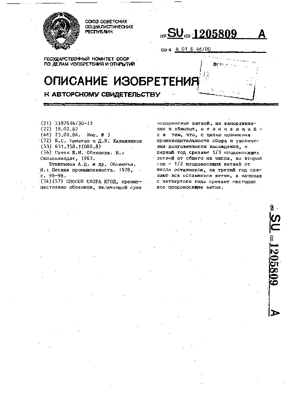 Способ сбора ягод / Ермаков Б. С., Калашников Д. В. // Описания изобретений (ретрофонд) / Комитет по патентам и товарным знакам России. – М., 2003. – 1986, № 1. — (Патенты России). — Загл. с титул. экрана. — Поисковая система: ИПС MIMOSA GTI. — Систем. требования: Acrobat Reader. — Режим доступа: ftp://smolensklib.ru/bd/patent_ru/pt1205809.pdf. — <URL:ftp://smolensklib.ru/bd/patent_ru/pt1205809.pdf>.