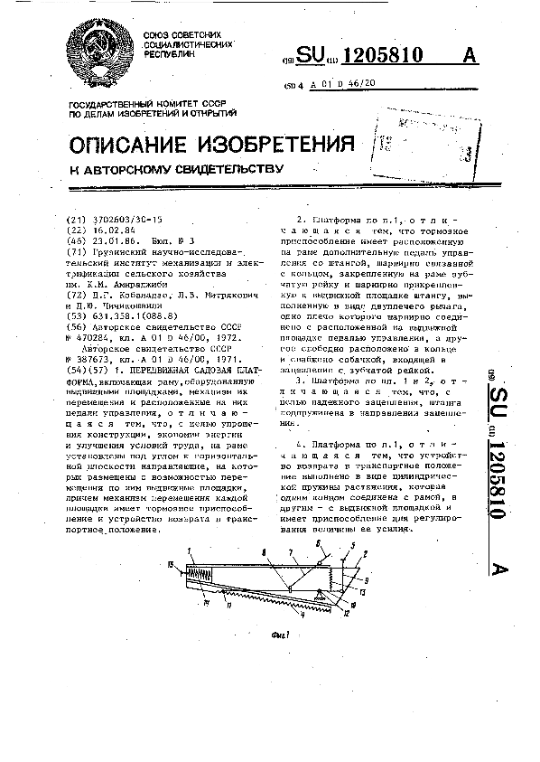 Передвижная садовая платформа / Кобаладзе Д. Г., Митрякович Л. В., Чичикошвили Д. Ю.; заявитель: Грузинский научно-исследова тельский институт механизации и электрификации сельского хозяйстваим. К. М. Амираджиби // Описания изобретений (ретрофонд) / Комитет по патентам и товарным знакам России. – М., 2003. – 1986, № 1. — (Патенты России). — Загл. с титул. экрана. — Поисковая система: ИПС MIMOSA GTI. — Систем. требования: Acrobat Reader. — Режим доступа: ftp://smolensklib.ru/bd/patent_ru/pt1205810.pdf. — <URL:ftp://smolensklib.ru/bd/patent_ru/pt1205810.pdf>.