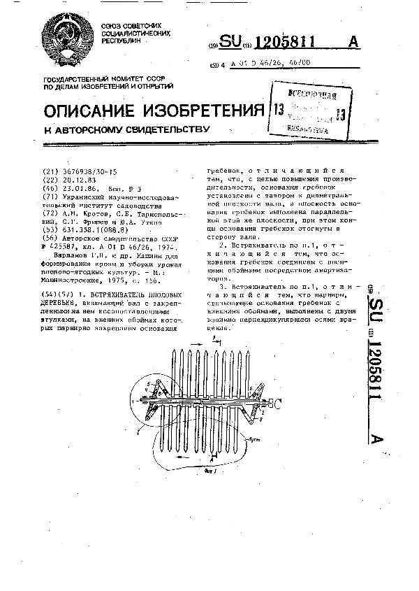 Встряхиватель плодовых деревьев / Кротов А. М., Тарнопольский С. Б., Фрышев С. Г. [и др.]; заявитель: Украинский научно-исследовательский институт садоводства // Описания изобретений (ретрофонд) / Комитет по патентам и товарным знакам России. – М., 2003. – 1986, № 1. — (Патенты России). — Загл. с титул. экрана. — Поисковая система: ИПС MIMOSA GTI. — Систем. требования: Acrobat Reader. — Режим доступа: ftp://smolensklib.ru/bd/patent_ru/pt1205811.pdf. — <URL:ftp://smolensklib.ru/bd/patent_ru/pt1205811.pdf>.
