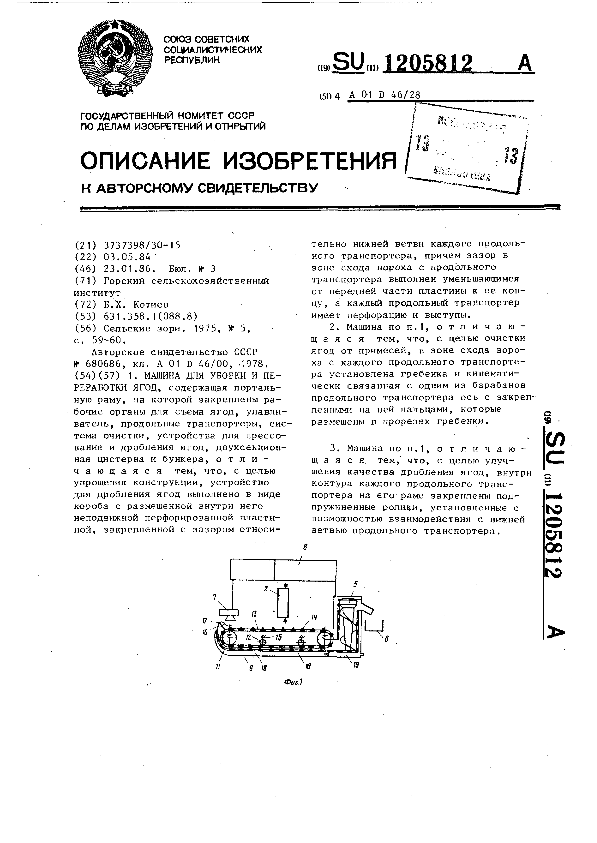 Машина для уборки и переработки ягод / Котиев Б. Х.; заявитель: Горский сельскохозяйственный институт // Описания изобретений (ретрофонд) / Комитет по патентам и товарным знакам России. – М., 2003. – 1986, № 1. — (Патенты России). — Загл. с титул. экрана. — Поисковая система: ИПС MIMOSA GTI. — Систем. требования: Acrobat Reader. — Режим доступа: ftp://smolensklib.ru/bd/patent_ru/pt1205812.pdf. — <URL:ftp://smolensklib.ru/bd/patent_ru/pt1205812.pdf>.