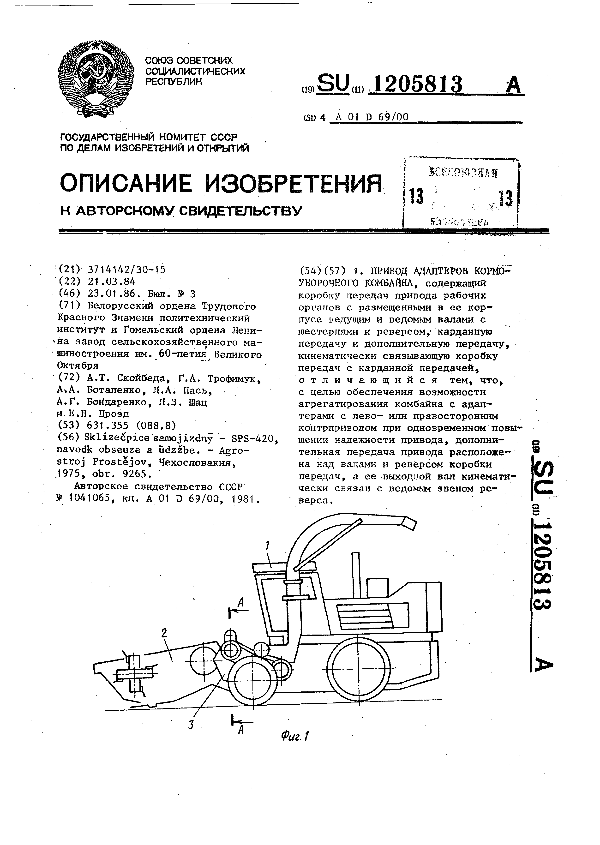 Привод адаптеров кормоуборочного комбайна / Скойбеда А. Т., Трофимук Г. А., Боталенко А. А. [ и др.]; заявитель: Белорусский ордена Трудового Красного Знамени политехнический институт, Гомельский ордена Ленина завод сельскохозяйственного машиностроения им. 60-летия Великого Октября // Описания изобретений (ретрофонд) / Комитет по патентам и товарным знакам России. – М., 2003. – 1986, № 1. — (Патенты России). — Загл. с титул. экрана. — Поисковая система: ИПС MIMOSA GTI. — Систем. требования: Acrobat Reader. — Режим доступа: ftp://smolensklib.ru/bd/patent_ru/pt1205813.pdf. — <URL:ftp://smolensklib.ru/bd/patent_ru/pt1205813.pdf>.