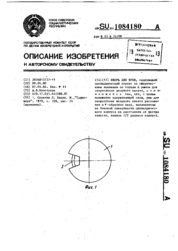 Якорь для буев / Колотухин А. В. // Описания изобретений (ретрофонд) / Комитет по патентам и товарным знакам России. – М. — (Патенты России)., 2003. – 1984, № 1. — Загл. с титул. экрана. — Поисковая система: ИПС MIMOSA GTI. — Систем. требования: Acrobat Reader. — Режим доступа: ftp://smolensklib.ru/bd/patent_ru/pt1084180.pdf. — <URL:ftp://smolensklib.ru/bd/patent_ru/pt1084180.pdf>.