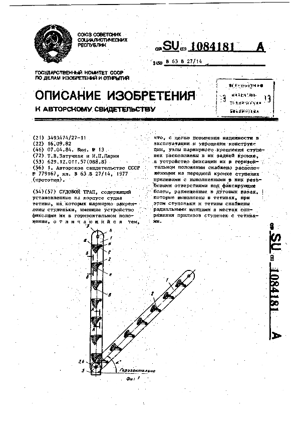 Судовой трап / Затучная Т. В., Ларин И. П. // Описания изобретений (ретрофонд) / Комитет по патентам и товарным знакам России. – М. — (Патенты России)., 2003. – 1984, № 1. — Загл. с титул. экрана. — Поисковая система: ИПС MIMOSA GTI. — Систем. требования: Acrobat Reader. — Режим доступа: ftp://smolensklib.ru/bd/patent_ru/pt1084181.pdf. — <URL:ftp://smolensklib.ru/bd/patent_ru/pt1084181.pdf>.