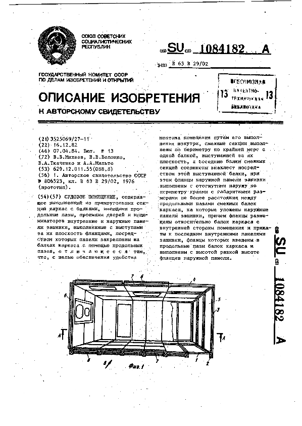 Судовое помещение / Михеев В. В., Волошко В. В., Ткаченко В. А., Мильто А. А. // Описания изобретений (ретрофонд) / Комитет по патентам и товарным знакам России. – М. — (Патенты России)., 2003. – 1984, № 1. — Загл. с титул. экрана. — Поисковая система: ИПС MIMOSA GTI. — Систем. требования: Acrobat Reader. — Режим доступа: ftp://smolensklib.ru/bd/patent_ru/pt1084182.pdf. — <URL:ftp://smolensklib.ru/bd/patent_ru/pt1084182.pdf>.