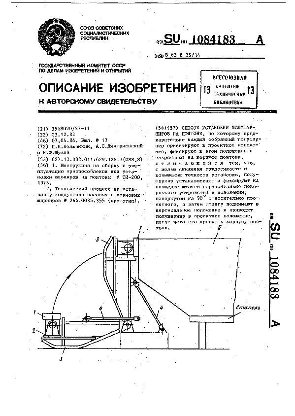 Способ установки полушарниров на понтоне / Волжанкин П. И., Дмитриевский А. С., Шумей Н. Ф. // Описания изобретений (ретрофонд) / Комитет по патентам и товарным знакам России. – М. — (Патенты России)., 2003. – 1984, № 1. — Загл. с титул. экрана. — Поисковая система: ИПС MIMOSA GTI. — Систем. требования: Acrobat Reader. — Режим доступа: ftp://smolensklib.ru/bd/patent_ru/pt1084183.pdf. — <URL:ftp://smolensklib.ru/bd/patent_ru/pt1084183.pdf>.