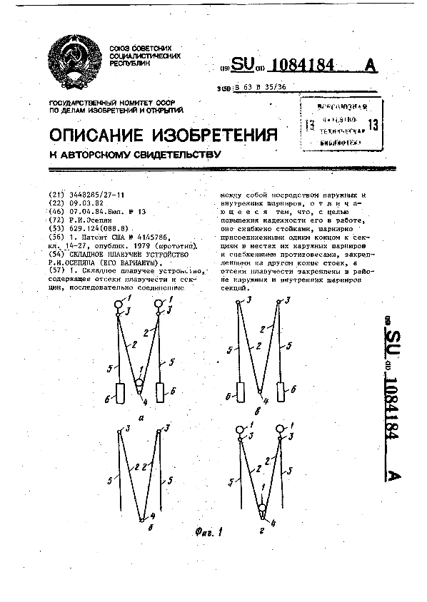 Складное плавучее устройство Р. И. Осепяна (его варинты) / Осепян Р. И. // Описания изобретений (ретрофонд) / Комитет по патентам и товарным знакам России. – М. — (Патенты России)., 2003. – 1984, № 1. — Загл. с титул. экрана. — Поисковая система: ИПС MIMOSA GTI. — Систем. требования: Acrobat Reader. — Режим доступа: ftp://smolensklib.ru/bd/patent_ru/pt1084184.pdf. — <URL:ftp://smolensklib.ru/bd/patent_ru/pt1084184.pdf>.