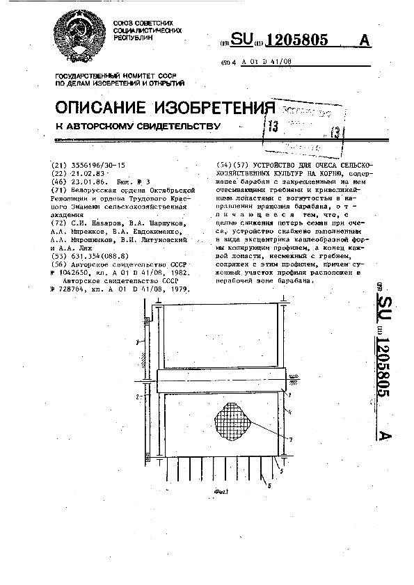 Устройство для очеса сельскохозяйственных культур на корню / Назаров С. И., Шаршунов В. А., Миренков А. А. [и др.]; заявитель: Белорусская ордена Октябрьской Революции и ордена Трудового Красного Знамени сельскохозяйственная академия // Описания изобретений (ретрофонд) / Комитет по патентам и товарным знакам России. – М., 2003. – 1986, № 1. — (Патенты России). — Загл. с титул. экрана. — Поисковая система: ИПС MIMOSA GTI. — Систем. требования: Acrobat Reader. — Режим доступа: ftp://smolensklib.ru/bd/patent_ru/pt1205805.pdf. — <URL:ftp://smolensklib.ru/bd/patent_ru/pt1205805.pdf>.