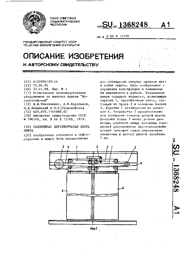Раздвижная двухстворчатая дверь лифта / Николаенко В. И., Корольков А. В., Белавский М. А., Старовойтова О. С.; заявитель: Могилевское производственное объединение по выпуску лифтов "Могилевлифтмаш" // Описания изобретений (ретрофонд) / Комитет по патентам и товарным знакам России. — М., 1994-____. — (Патенты России). – 1988, № 1. — Загл. с титул. экрана. — Поисковая система: ИПС MIMOSA GTI. — Систем. требования: Acrobat Reader. — Режим доступа: ftp://smolensklib.ru/bd/patent_ru/pt1368248.pdf. — <URL:ftp://smolensklib.ru/bd/patent_ru/pt1368248.pdf>.