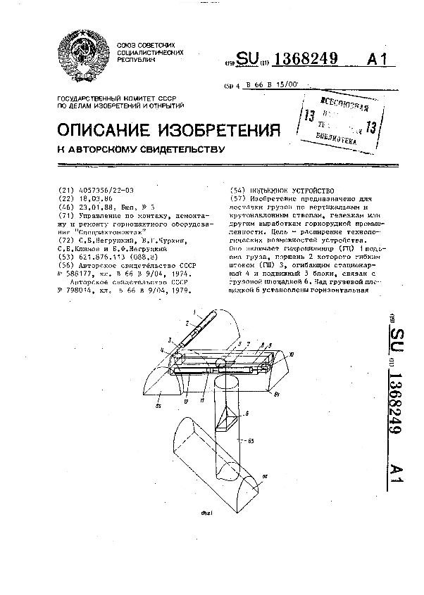 Подъемное устройство / Негруцкий С. Б., Чуркин В. Г., Климов С. Б., Негруцкий Б. Ф.; заявитель: Управление по монтажу, демонтажу и ремонту горношахтного оборудования "Спецшахтомонтаж" // Описания изобретений (ретрофонд) / Комитет по патентам и товарным знакам России. — М., 1994-____. — (Патенты России). – 1988, № 1. — Загл. с титул. экрана. — Поисковая система: ИПС MIMOSA GTI. — Систем. требования: Acrobat Reader. — Режим доступа: ftp://smolensklib.ru/bd/patent_ru/pt1368249.pdf. — <URL:ftp://smolensklib.ru/bd/patent_ru/pt1368249.pdf>.