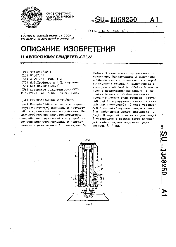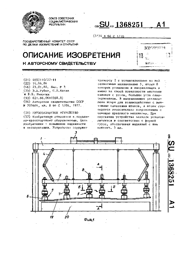 Грузозахватное устройство / Рубин Э. А., Коган С. Л., Микитюк В. В. // Описания изобретений (ретрофонд) / Комитет по патентам и товарным знакам России. — М., 1994-____. — (Патенты России). – 1988, № 1. — Загл. с титул. экрана. — Поисковая система: ИПС MIMOSA GTI. — Систем. требования: Acrobat Reader. — Режим доступа: ftp://smolensklib.ru/bd/patent_ru/pt1368251.pdf. — <URL:ftp://smolensklib.ru/bd/patent_ru/pt1368251.pdf>.