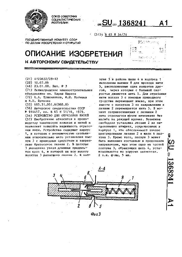 Устройство для отрезания нитей / Тупиченков Е. А., Матюшев И. И., Буличев В. П.; заявитель: Ленинградское машиностроительное объединение им. Карла Маркса // Описания изобретений (ретрофонд) / Комитет по патентам и товарным знакам России. — М., 1994-____. — (Патенты России). – 1988, № 1. — Загл. с титул. экрана. — Поисковая система: ИПС MIMOSA GTI. — Систем. требования: Acrobat Reader. — Режим доступа: ftp://smolensklib.ru/bd/patent_ru/pt1368241.pdf. — <URL:ftp://smolensklib.ru/bd/patent_ru/pt1368241.pdf>.