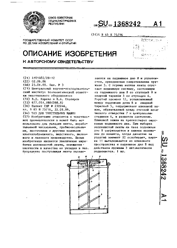 Таз для текстильных машин / Карезо В. Д., Столяров В. А.; заявитель: Центральный научно-исследовательский институт технологической оснастки текстильного оборудования // Описания изобретений (ретрофонд) / Комитет по патентам и товарным знакам России. — М., 1994-____. — (Патенты России). – 1988, № 1. — Загл. с титул. экрана. — Поисковая система: ИПС MIMOSA GTI. — Систем. требования: Acrobat Reader. — Режим доступа: ftp://smolensklib.ru/bd/patent_ru/pt1368242.pdf. — <URL:ftp://smolensklib.ru/bd/patent_ru/pt1368242.pdf>.