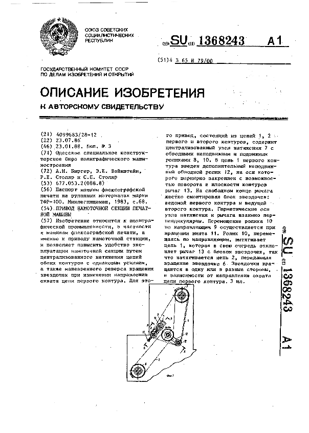 Привод намоточной секции печатной машины / Биргер А. И., Вайнштейн Э. Е., Столяр Р. Е., Столяр С. Е.; заявитель: Одесское специальное конструкторское бюро полиграфического машиностроения // Описания изобретений (ретрофонд) / Комитет по патентам и товарным знакам России. — М., 1994-____. — (Патенты России). – 1988, № 1. — Загл. с титул. экрана. — Поисковая система: ИПС MIMOSA GTI. — Систем. требования: Acrobat Reader. — Режим доступа: ftp://smolensklib.ru/bd/patent_ru/pt1368243.pdf. — <URL:ftp://smolensklib.ru/bd/patent_ru/pt1368243.pdf>.