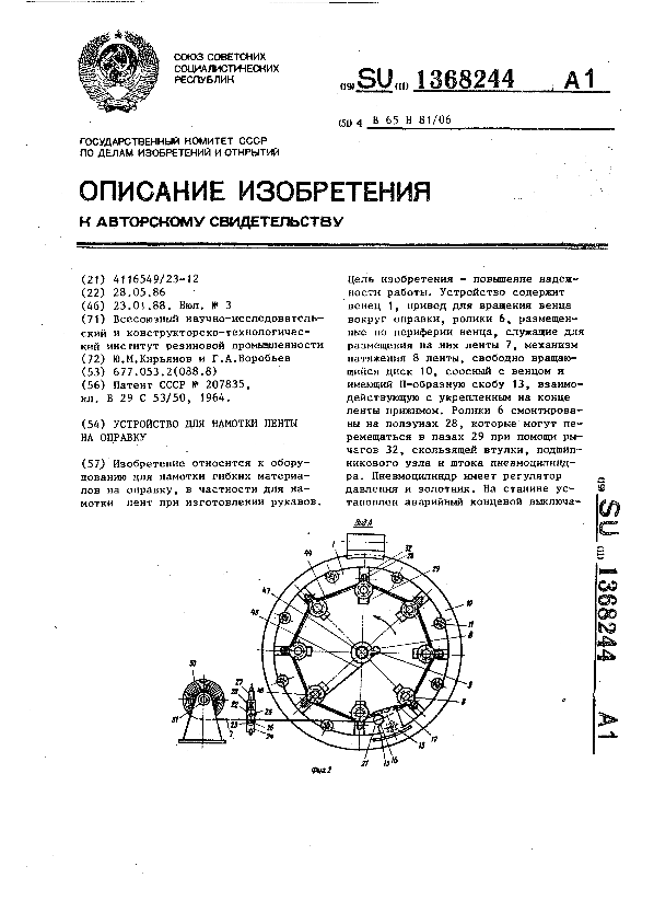 Устройство для намотки ленты на оправку / Кирьянов Ю. М., Воробьев Г. А.; заявитель: Всесоюзный научно-исследовательский и конструкторско-технологический институт резиновой промышленности // Описания изобретений (ретрофонд) / Комитет по патентам и товарным знакам России. — М., 1994-____. — (Патенты России). – 1988, № 1. — Загл. с титул. экрана. — Поисковая система: ИПС MIMOSA GTI. — Систем. требования: Acrobat Reader. — Режим доступа: ftp://smolensklib.ru/bd/patent_ru/pt1368244.pdf. — <URL:ftp://smolensklib.ru/bd/patent_ru/pt1368244.pdf>.