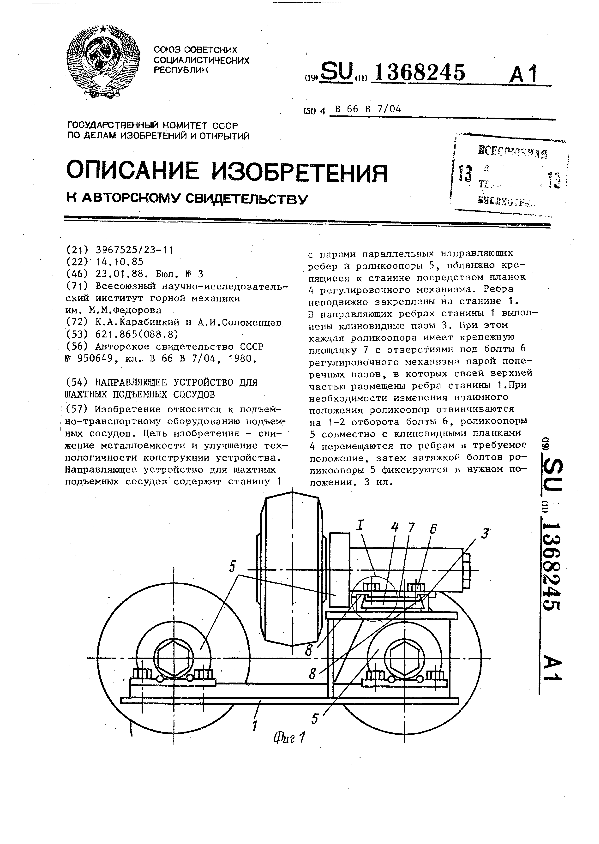 Направляющее устройство для шахтных подъемных сосудов / Карабицкий К. А., Соломенцев А. И.; заявитель: Всесоюзный научно-исследовательский институт горной механики им. М. М. Федорова // Описания изобретений (ретрофонд) / Комитет по патентам и товарным знакам России. — М., 1994-____. — (Патенты России). – 1988, № 1. — Загл. с титул. экрана. — Поисковая система: ИПС MIMOSA GTI. — Систем. требования: Acrobat Reader. — Режим доступа: ftp://smolensklib.ru/bd/patent_ru/pt1368245.pdf. — <URL:ftp://smolensklib.ru/bd/patent_ru/pt1368245.pdf>.
