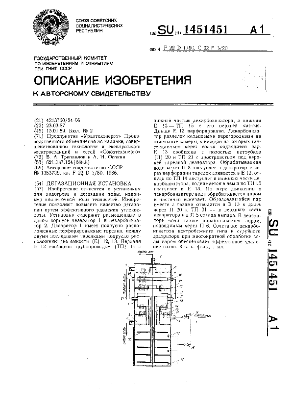 Дегазационная установка / Трепавлов В. А., Осокин А. И.; заявитель: Предприятие «Уралтехэнерго» Производственного объединения по наладке, совершенствованию технологии и эксплуатации электростанций и сетей «Союзтехэнерго» // Описания изобретений (ретрофонд) / Комитет по патентам и товарным знакам России. – М., 2003. – 1989, № 1. — (Патенты России). — Загл. с титул. экрана. — Поисковая система: ИПС MIMOSA GTI. — Систем. требования: Acrobat Reader. — Режим доступа: ftp://smolensklib.ru/bd/patent_ru/pt1451451.pdf. — <URL:ftp://smolensklib.ru/bd/patent_ru/pt1451451.pdf>.