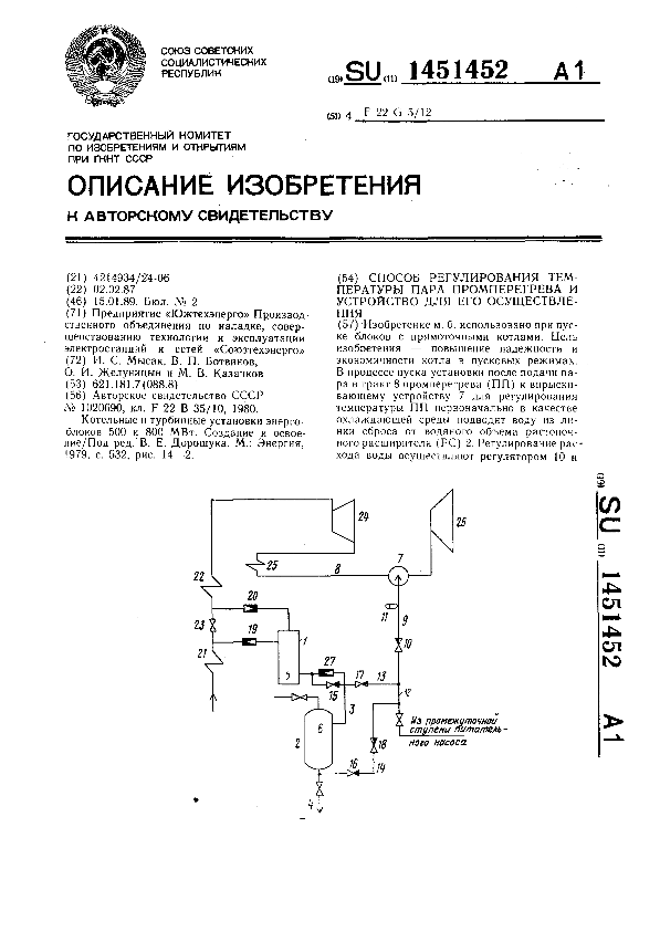 Способ регулирования температуры пара промперегрева и устройство для его осуществления / Мысак И. С., Ботвинов В. П., Желуницын О. И., Казачков М. В.; заявитель: Предприятие «Уралтехэнерго» Производственного объединения по наладке, совершенствованию технологии и эксплуатации электростанций и сетей «Союзтехэнерго» // Описания изобретений (ретрофонд) / Комитет по патентам и товарным знакам России. – М., 2003. – 1989, № 1. — (Патенты России). — Загл. с титул. экрана. — Поисковая система: ИПС MIMOSA GTI. — Систем. требования: Acrobat Reader. — Режим доступа: ftp://smolensklib.ru/bd/patent_ru/pt1451452.pdf. — <URL:ftp://smolensklib.ru/bd/patent_ru/pt1451452.pdf>.