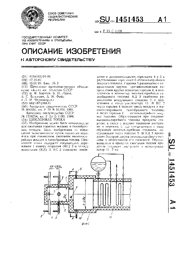 Циклонная топка / Бармин В. Ф., Лурье Б. И., Есилевич Б. С. [и др.]; заявитель: Щекинское производственное объединение «Азот» им. 50-летия СССР // Описания изобретений (ретрофонд) / Комитет по патентам и товарным знакам России. – М., 2003. – 1989, № 1. — (Патенты России). — Загл. с титул. экрана. — Поисковая система: ИПС MIMOSA GTI. — Систем. требования: Acrobat Reader. — Режим доступа: ftp://smolensklib.ru/bd/patent_ru/pt1451453.pdf. — <URL:ftp://smolensklib.ru/bd/patent_ru/pt1451453.pdf>.