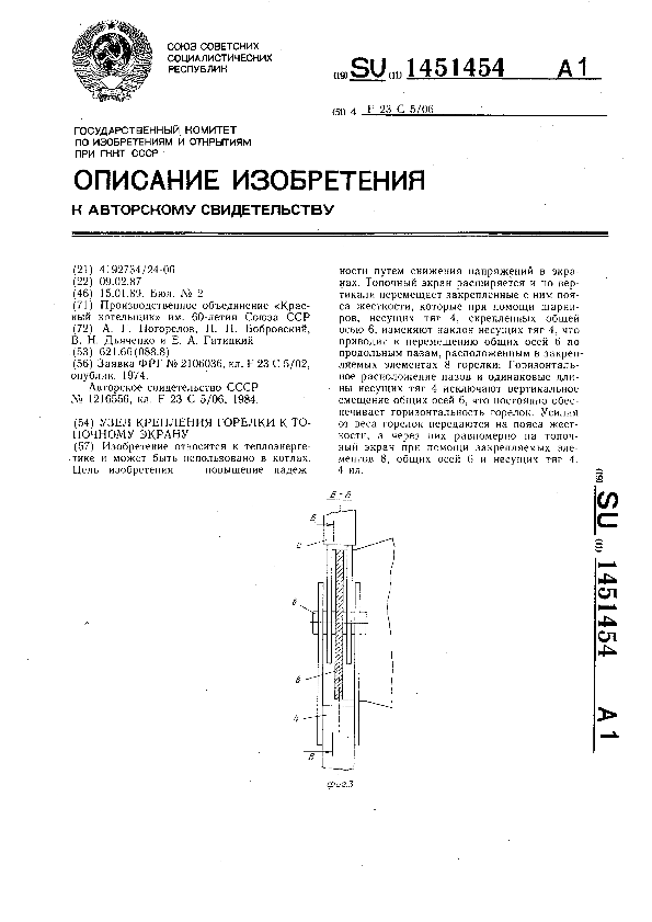 Узел крепления горелки к топочному экрану / Погорелов А. Г., Бобровский Н. Н., Дьяченко В. Н., Гатицкий Е. А.; заявитель: Производственное объединение «Красный котельщик» им. 60-летия Союза ССР // Описания изобретений (ретрофонд) / Комитет по патентам и товарным знакам России. – М., 2003. – 1989, № 1. — (Патенты России). — Загл. с титул. экрана. — Поисковая система: ИПС MIMOSA GTI. — Систем. требования: Acrobat Reader. — Режим доступа: ftp://smolensklib.ru/bd/patent_ru/pt1451454.pdf. — <URL:ftp://smolensklib.ru/bd/patent_ru/pt1451454.pdf>.