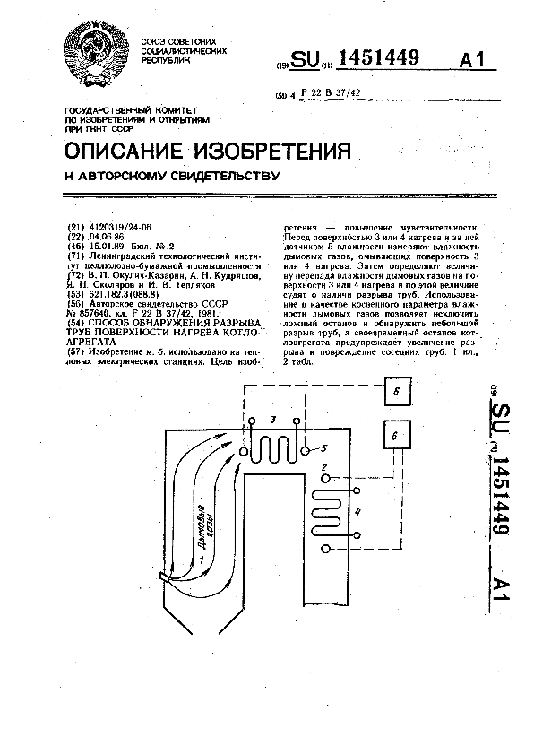 Способ обнаружения разрыва труб поверхности нагрева котлоагрегата / Окулич-Казарин В. П., Кудряшов А. Н., Сколяров Я. Н., Тепляков И. В.; заявитель: Ленинградский технологический институт целлюлозно-бумажной промышленности // Описания изобретений (ретрофонд) / Комитет по патентам и товарным знакам России. – М., 2003. – 1989, № 1. — (Патенты России). — Загл. с титул. экрана. — Поисковая система: ИПС MIMOSA GTI. — Систем. требования: Acrobat Reader. — Режим доступа: ftp://smolensklib.ru/bd/patent_ru/pt1451449.pdf. — <URL:ftp://smolensklib.ru/bd/patent_ru/pt1451449.pdf>.